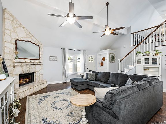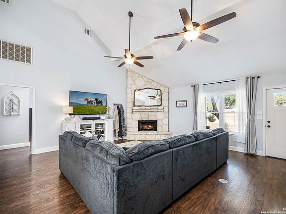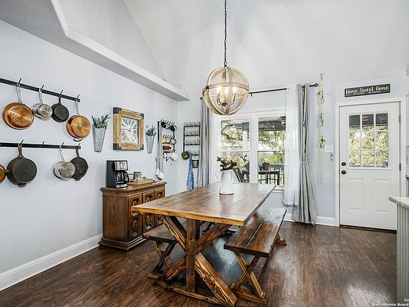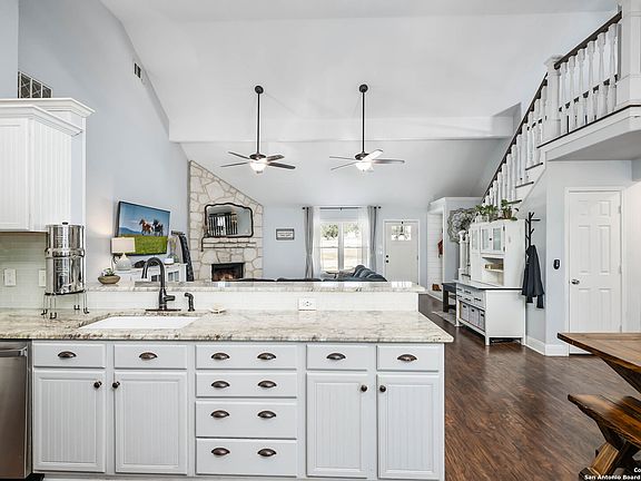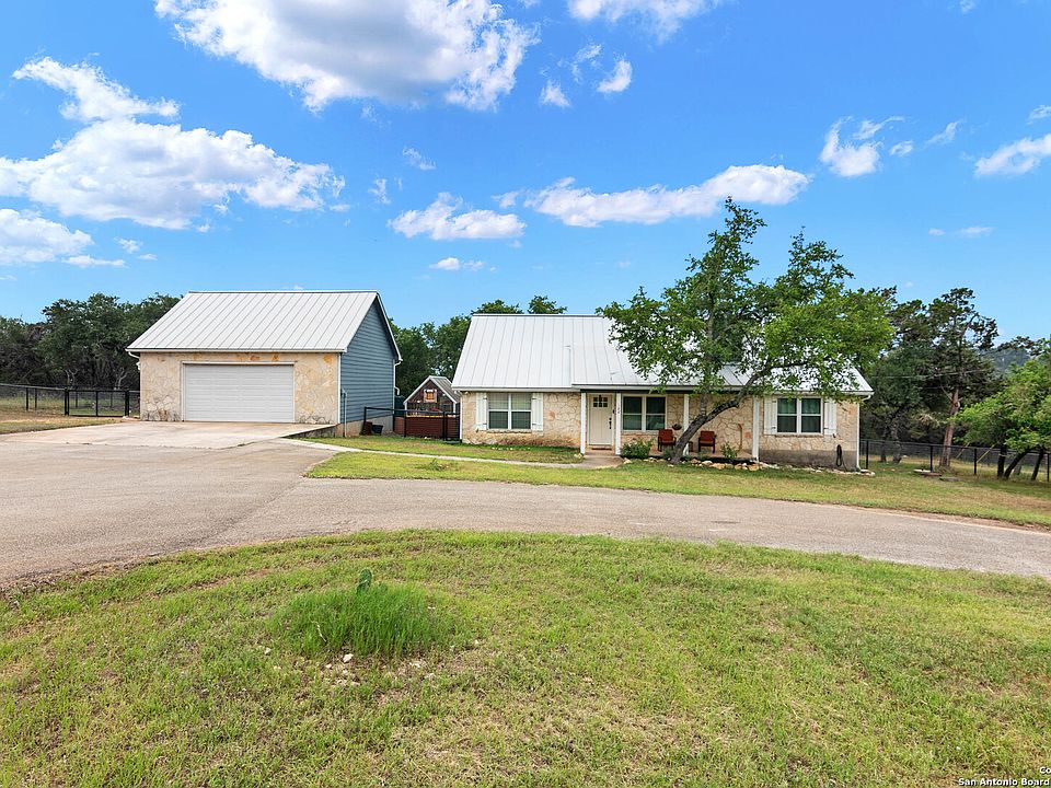 Escape to the serene Texas Hill Country with this delightful 1.5-story farmhouse, set on just over an acre of land. This home offers the perfect blend of country living and modern convenience, ideally located near Canyon Lake, Blanco, Fredericksburg, and San Antonio. With ample space to store your boat or RV, this property is a dream for outdoor enthusiasts who want easy access to the area's best recreation and scenic landscapes. As you enter, the home welcomes you with its open and airy layout, designed for both comfort and functionality. The living, dining, and kitchen areas flow effortlessly together, making it perfect for gatherings of all sizes. Large windows flood the space with natural light, showcasing the beautiful finishes throughout. The kitchen, equipped with wood and beadboard cabinetry, sleek granite countertops, and stainless steel appliances, provides plenty of room for culinary creativity. A raised breakfast bar overlooks the living area, and the kitchen also includes a spacious pantry and utility room for added convenience. This home features three spacious bedrooms on the main floor, each offering a peaceful retreat. The primary suite boasts an updated ensuite bathroom with high-end finishes, while the two additional bedrooms share a newly renovated bathroom. Recent updates to the home include new windows, a new HVAC system, a metal fence, and a 50-amp hookup for your RV. Step outside, and you'll find a property designed for both relaxation and productivity. The large detached garage doubles as a workshop, including a 25' x 5' insulated storage area. There's also a chicken coop, four raised garden beds with adjustable sun protection, and plenty of outdoor space for entertaining or simply enjoying the tranquil surroundings. Imagine evenings spent on the patio, or cozy nights by a bonfire under the stars.