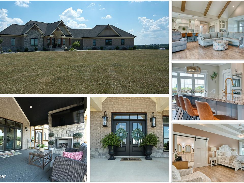 From the moment you arrive, the home's striking exterior commands attention, with its contemporary color palette and meticulously curated landscaping that seamlessly blends modern trends with timeless sophistication. Step inside, and the open-concept great room will take your breath away. Bathed in natural light, this expansive space radiates warmth and serenity with its vaulted ceiling, adorned with natural wood cross-beams, and a show-stopping cobble stone fireplace that anchors the room. Perfect for hosting unforgettable gatherings, the great room flows effortlessly to a covered deck showcasing jaw-dropping views of the rolling countryside - a host's dream come true.