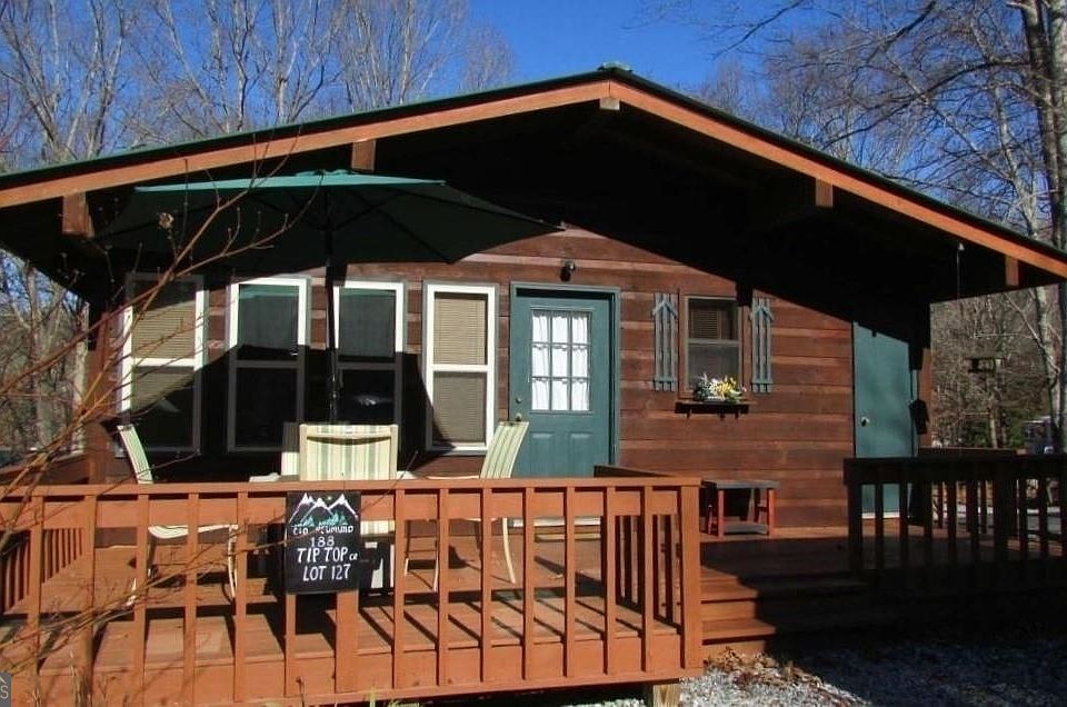 Looking for a serene mountain vacation getaway? Look no further! This impeccably maintained rustic cabin has front deck for outdoor enjoyment and a 56ft long parking pad that will accommodate almost any camper! Camper in pic not included in sale - for illustration only. Inside there's a vaulted pine ceiling with exposed beams plus pine walls and floors! Amazing wall of windows gives you a view of the park and greenspace out back! Fully furnished with a sleeper sofa, coffee table that raises for desk type use, queen size poster bed, and tv. The kitchen has tile floors, stainless sink, table with 4 chairs, refrigerator, microwave and a 2-burner hotplate. Full bath has a roomy seated shower, tile floors, ceramic toilet and a closet with a tall chest! Pull-down stairs lead to a spacious loft that would be great storage or use your imagination to create your own unique loft space! New HVAC /PTAC unit installed in 2020 and the metal roof is about 5 years old! New plumbing was installed under the cabin in 2023. A close walk to the pool and all amenities! Located just minutes to Cleveland, Helen, Dahlonega, Clarkesville, and Blairsville. Shop! Dine! Fish! Hike! Enjoy vineyards and more! Agents are owners in Paradise Valley, so call for more info! Paradise is a gated seasonal living vacation community. No full time living.