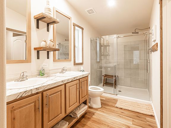 The dining area flows into a cozy living room centered around a striking stacked-stone fireplaceperfect for Montana evenings. The spacious primary suite offers a tranquil retreat with wood accents, soft lighting, and a barn-style sliding door to the en-suite bath. Large windows throughout the home frame the majestic mountain views, bringing Montana's beauty inside.