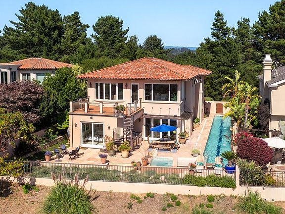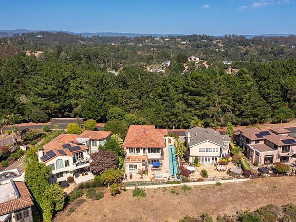 Nestled within an exclusive gated community, this stunning 3-bedroom, 3+bath residence offers breathtaking ocean views and unforgettable sunsets. The thoughtfully designed reverse floor plan takes full advantage of the sweeping vistas, filling the home with natural light. As you step inside, you'll be drawn to the handcrafted metal staircase that leads to the expansive upstairs great room -- the heart of the home. Here, you'll find custom cabinetry with abundant storage, top-tier appliances, including a Bosch dishwasher, GE Monogram refrigerator, double ovens, and a GE Profile microwave. Relax by the cozy fireplace or step onto the balcony to take in the fresh ocean breeze and view. The primary bedroom captures the morning sunrise and the occasional moonrise. An elevator brings you downstairs to a serene library and a spacious office, both featuring built-in cabinetry, plus two additional bedrooms, two bathrooms, a media area, and access to the outdoor kitchen overlooking the hot tub and sparkling lap pool. Entertain or unwind at the end of the day. Picture yourself watching the sun dip into the Pacific from your private spa. Conveniently located near Seascape, the beach, freeway, hiking trails, schools, shopping, and dining. Coastal living at its finest. Time to make it yours!