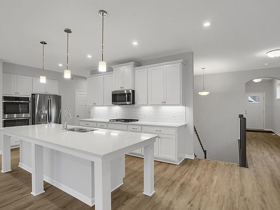 Starting off the open-concept floorplan, the lifestyle kitchen features stainless steel appliances that include a 30” gas cooktop, a double-wall oven, a fingerprint-resistant dishwasher, and a counter-depth refrigerator.