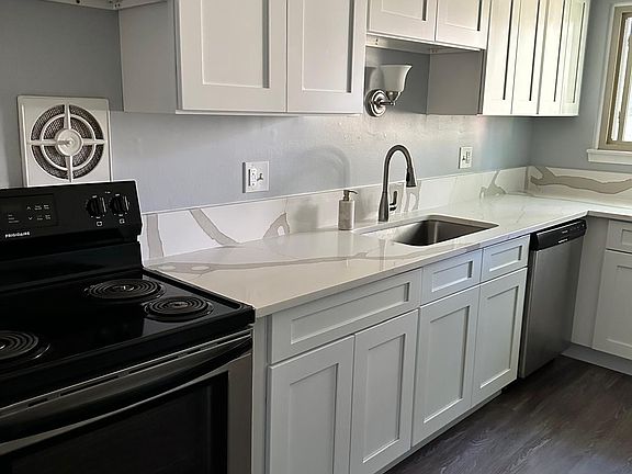 The kitchen features a granite countertop, brand-new white soft-closing cabinets, and updated appliances including a refrigerator, microwave, dishwasher, and range. The bathroom has been fully renovated with granite flooring, a granite shower surround, an upgraded faucet, and a stylish new vanity, offering a spa-like experience.