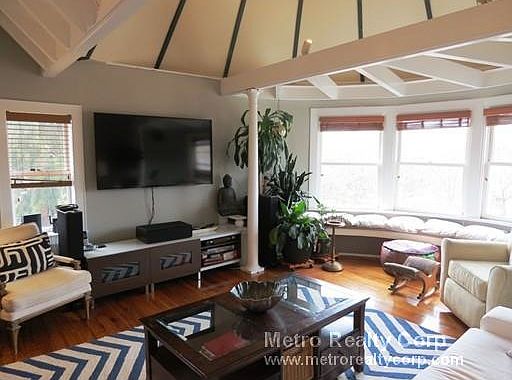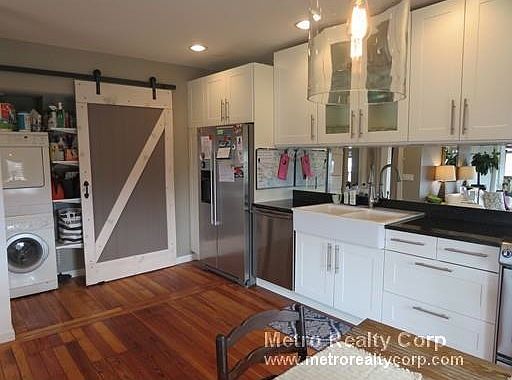 Renovated 3rd floor corner unit in Brookline's Washington Square. The unit has an immaculate kitchen boasting stainless steel appliances, a farmers sink, and lovely white cabinetry. The open living concept and vaulted ceilings give this unit a truly modern feel. Washer and Dryer are conveniently located in the unit and heat and hot water are included in the price of rent.