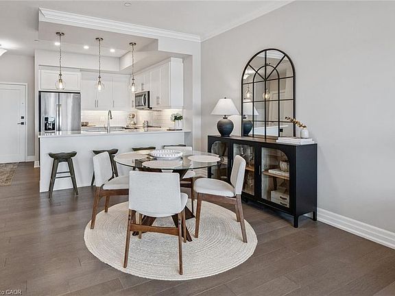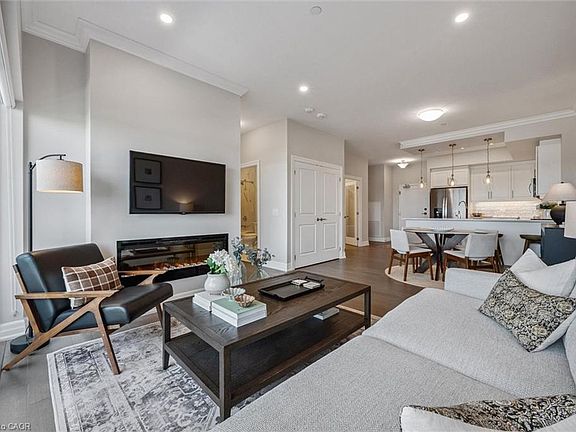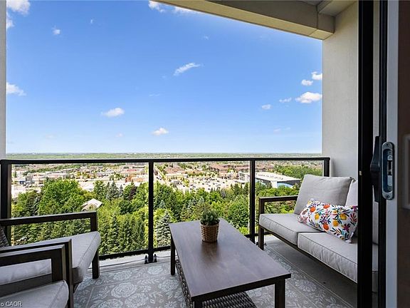 Welcome to 1010-1880 Gordon St, elegant 1-bdrm + den condo perched high above Guelph’s sought-after south end! From the moment you step inside, you’re greeted by expansive wall of windows framing panoramic views of lush treetops & the city skyline—an inspiring backdrop for everyday living. Meticulously designed W/upscale finishes, this modern suite exudes comfort & sophistication. Soaring ceilings & wide-plank engineered hardwood floors create an airy sun-drenched ambience that flows seamlessly through the open-concept living space. Relax by sleek B/I fireplace in living room or step onto private balcony—perfect retreat for morning coffee or unwind while taking in beautiful city views. Gourmet kitchen features crisp white cabinetry, gleaming quartz counters, classic subway tile backsplash & premium S/S appliances. Oversized breakfast bar accented by stylish pendant lighting, invites casual dining & entertaining. Retreat to spacious primary bdrm where floor-to-ceiling windows deliver the same breathtaking vistas & fill the room W/natural light. Luxurious 4pc bath W/oversized vanity, quartz counter & deep soaker tub surrounded by marble-inspired tile. Elegant French doors reveal versatile den—ideal as home office, guest room or creative studio. Thoughtful storage solutions include large W/I closet in entryway & large pantry off the dining area keeping everything organized & within reach. Residents enjoy impressive array of amenities: state-of-the-art fitness centre, golf simulator lounge W/bar, entertaining spaces W/full kitchen & billiards, guest suite & landscaped outdoor terrace. Underground parking for yr-round convenience . Steps to Pergola Commons where you have access to everyday essentials—groceries, cafes, restaurants & shops plus quick connections to 401 for commuting. Whether you’re picking up fresh produce, meeting friends for dinner or exploring nearby parks & trails, this vibrant neighbourhood has it all! Experience the elevated lifestyle you deserve