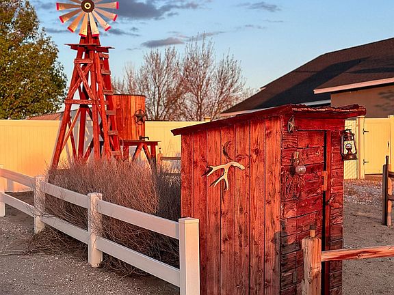 Country living, but close to town! Open floorplan, high ceilings. Beautifully landscaped irrigated lot provides privacy & an abundance of outdoor living space. Whole-home water filtration system. Spacious fully-fenced backyard adorned with trees, fire-pit, large concrete patio & covered porch. 45x15 prepped garden ready for planting. Fresh gravel for additional parking. Oversized master bedroom with crown molding & walk-in closet. Master bathroom has jetted tub, his/her vanities, & separate walk-in shower., Kitchen features beautiful pendant lighting, Corian countertops, pantry & SS appliances. 3-car garage with epoxy floors. Separate 2-car shop with concrete slab & carport. Additional metal storage shed. Home wired for emergency generator hookup & a 50-amp hookup on the detached shop for an RV. The exterior of the home & shop were completely painted in July 2021.