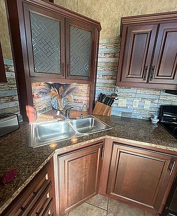 Kitchen was “upgraded” when it was built so it has nice dark wood cabinetry and a set of pull-outs for easy storage