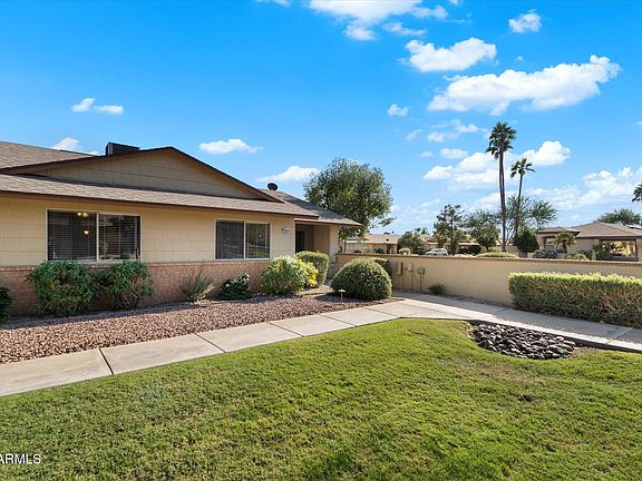 Enjoy the active,carefree,lifestyle you've dreamed of in this beautifully maintained Sun City townhome!Perfect for year-round living or winter retreat.This light & bright 2 bd,2 ba.,end unit offers vaulted ceilings, elegant 20'' tile flrs,updated kitch.,maple cabinets & granite-look counters.Previous owner replaced fridge,dishwasher,sink,water heater,HVAC & interior paint.Spacious primary suite w/walk-in closet & upgraded dual-sink vanity.Inside laundry rm.Garage w/ direct inside access.Large covered patio, w/roller shades,tile floors & misting system.Private yard & orange tree,produces delicious oranges. Enjoy fresh squeezed orange juice!Sun City West offers resort-style rec. centers,indoor/outdoor heated pool,golf,tennis,pickleball,parks & social events.Close to shopping & hospital.
