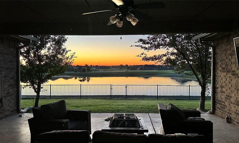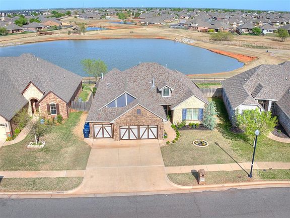 As you enter the house, you'll feel as if you're floating on water, thanks to the up-close and personal waterfront view. Located in the desirable Deer Creek School district, this rare waterfront offering is a gem. Boasting 4 bedrooms, 3 bathrooms, and a huge bonus room, this fantastic Spanish inspired interior style home has everything you need on one floor. Natural light floods the home through big windows, enhancing the bright and airy feel throughout. The bonus room is a highlight, featuring a stone fireplace, beamed ceilings, and outstanding views. Perfect for entertaining, the open kitchen is equipped with a large center island, built-in appliances, and a walk-in pantry. The primary suite is a private oasis, complete with patio access, an expansive en suite, a walk-in closet, and a stunning view you can enjoy even while lying in bed. One of the secondary bedrooms includes its own full bathroom, ideal for guests or family members seeking extra privacy. Additional features include an oversized mud bench, a 3-car garage, and a storm shelter. Stepping out back, you'll find a peaceful retreat with an extra-large covered patio, direct greenbelt access, and tranquil views of a beautiful pond. The Grove neighborhood offers resort-style amenities, including two pools, a splash pad, stocked ponds, a basketball court, a soccer field, multiple playgrounds, a gym, and clubhouses. If you're looking for a home that combines luxury, comfort, and a spectacular waterfront setting, this is the one!