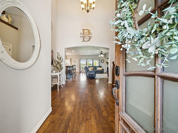 Lovely updated home in the Broken Arrow School District, perfectly situated on a serene pond-view lot. This move-in ready property welcomes you with beautiful wood floors, fresh paint, and tall ceilings. Just off the entry, the formal dining room connects to the kitchen through a butler’s pantry—ideal for a coffee bar or extra storage. The kitchen features stainless steel appliances with a vent hood, a center island with bar seating, and opens seamlessly into the living room. A breakfast nook provides an additional space to dine or entertain, while a wall of windows fills the home with natural northern light. The stone corner fireplace adds both charm and warmth to the living area. The private primary suite offers brand new carpet, updated paint, and plenty of space for a sitting area. Its en suite bathroom includes dual sinks, a separate tub and shower, private water closet, and a generous walk-in closet with ample storage. Upstairs, brand new carpet continues into a spacious game room or second living area complete with a wet bar, two additional bedrooms with walk-in closets, and a full hall bath. Convenient walk-out attic access adds easy storage solutions. Step outside to enjoy the large patio featuring an outdoor fireplace with room for both seating and dining, all overlooking the tranquil pond and fully fenced yard. A three-car garage includes a sizable storm shelter for peace of mind. This home is beautifully updated, thoughtfully designed, and completely turn-key.