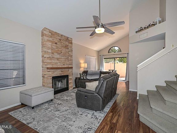 This rare 2-bedroom, 2-bathroom + office/den home offers the perfect blend of style, comfort, and convenience—located just minutes from Loop 101 and I-17. As you enter, you'll be greeted by soaring cathedral ceilings, abundant natural light, and a spacious great room featuring a stunning stone-faced fireplace and wood-style flooring throughout the first floor.