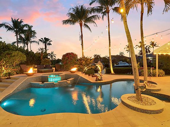 AVAILABLE for Remainder of 2025! Embrace the ultimate waterfront lifestyle in this exquisite 4,336 sq. ft. home, offering over 100 feet of prime Loxahatchee River frontage & direct access to the Atlantic Ocean within just 15 minutes. This stunning property, set on 2/3 of an acre, features 4 bedrooms, 5 bathrooms, and an array of luxurious amenities designed for both comfort and elegance. Step outside and discover unmatched outdoor living with gorgeous gas fire features in the backyard, creating the perfect ambiance for evening gatherings. The property boasts a recently built dock with a 40,000-pound boat lift, a heated spa and pool, and an expansive outdoor kitchen--ideal for hosting. Immaculate landscaping includes a turf yard, a four-hole putting green, & plenty of space for entertaining guests.