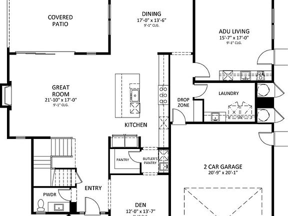 This 5-bedroom, 4.5-bath Traditional-style home offers timeless curb appeal with horizontal siding, black-trimmed windows, and a covered front porch with modern sconces. Inside, a bright foyer opens to a spacious den, ideal for a home office. The main floor features an open-concept great room with fireplace, dining area with patio access, and a private ADU suite complete with living area, bedroom, and full bath-perfect for guests or multi-generational living. The gourmet kitchen includes a walk-in and butler's pantry, waterfall island with bar seating, quartz countertops, and a professional dual-fuel range.