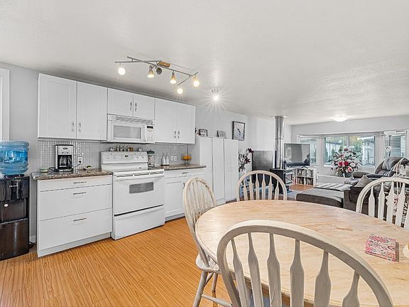 The freshly painted living area is bright and welcoming, complemented by a cozy wood-burning stove for added warmth and charm. The spacious primary bedroom includes a generous 65 sq.ft. walk-in closet that can easily double as a home office or den.