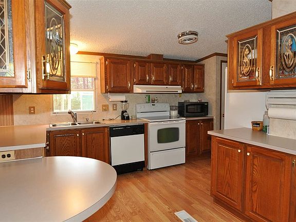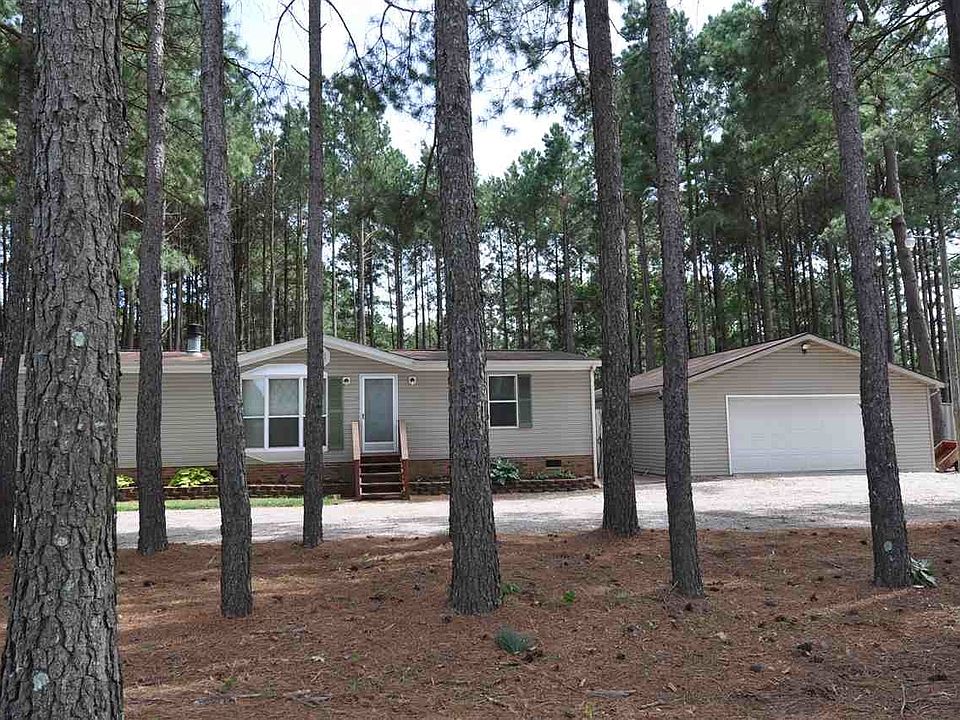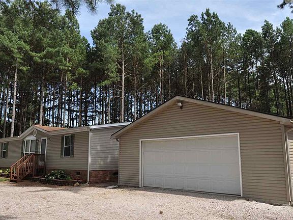 Great Buy in the Country! Manufactured double- wide perched on 1.7 acres surrounded w/Southern Pines. This home, w/Lg detached garage & Extra bldg. for storage, is clean as a whistle & offers a 3 BR, 2BA Split Floor plan along w/a Spacious Master, Family Room w/Wood Burning FP, Built in Bookcases, Lg Eat in Kitchen (w/desk area) & Formal Dining. The MH has been detitled per owner and taxed together with the land. Privacy Fence in the back only. LISTED LOWER THAN TAX VALUE!