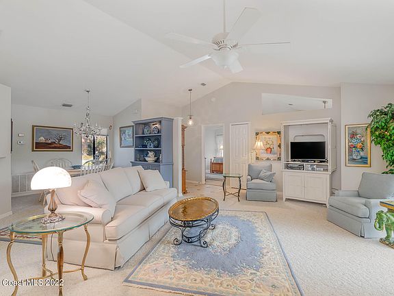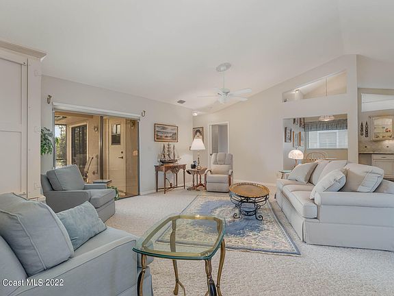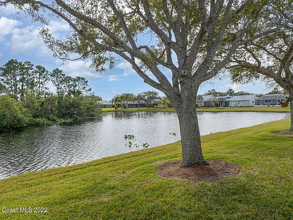 This charming LAKE FRONT Madison model, located in a military, country club community, is immaculately maintained and shows pride of ownership. Vaulted ceilings, bright, open floor plan, spacious bedrooms, AND WOW WHAT A VIEW! Primary bedroom includes a private sitting room/office off of the bedroom, which leads through sliders to the trussed and screened lanai. Primary bathroom has two walk in closets, private toilet, dual sinks, additional countertop space and cabinets along with walk-in shower. Kitchen has Corian countertops and an expanded breakfast nook. Enclosed laundry room under air. This home has spectacular views of water and preserve. Enjoy the serene views and the Florida wildlife from your back porch! Home to over 600 Military Veterans, Indian River Colony Club is a Private 55+ Country Club community with an extensive maintenance program for each home, an 18-hole golf course, fine dining restaurant with an executive chef & the 19th Hole restaurant and bar, fitness center, heated swimming pool, tennis courts, croquet, bocce ball, shuffleboard, pet-friendly, gated community with over 40 activities groups that have you feeling like you are on vacation.