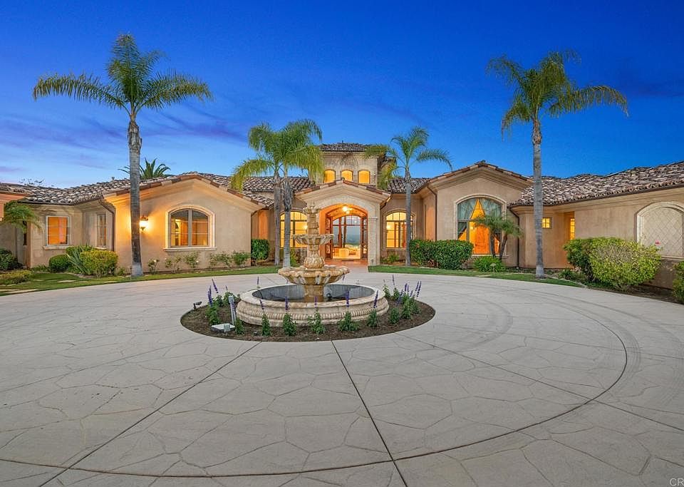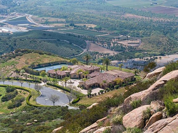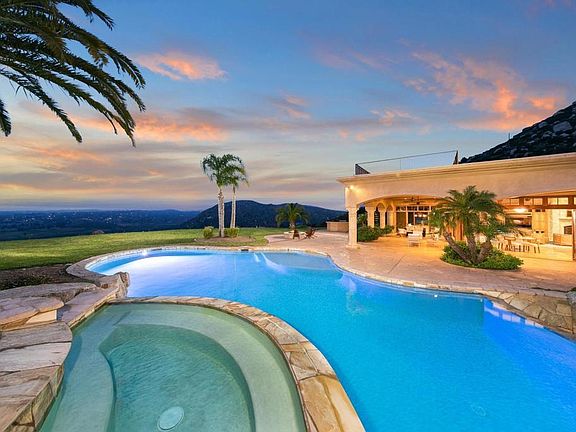 Perched at the apex of The Heritage Estates, this sprawling single-level residence stretches out across 10,527 square feet offering unparalleled views across the San Pasqual Valley and evening sunsets. Set on a 10.15-acre site and constructed by master builder Mark Agee, this home stands as a testament to quality and refinement at the top of one of San Diego’s most exclusive developments and best kept secrets. Known for its proximity to the world-class Maderas Golf Course, The Heritage Estates is a guard-gated community of custom-built homes and often attracts professional athletes, and other high-net worth individuals seeking exclusivity and privacy. Just a short drive to Del Mar beach and downtown San Diego, Poway is renowned for its top-of-the-line public education and strong sense of community. Approaching the circular driveway, the estate reveals its magnificence, with a separate 1-bedroom/1-bathroom guest house providing both comfort and seclusion for friends or family alike. The main residence, featuring 6 bedrooms and 8.5 bathrooms, exudes opulence with each meticulously designed detail. The heart of this home is its chef's kitchen, a culinary haven with top-of-the-line appliances and a large central island. The spacious family room, adorned with a fireplace of stacked stone, seamlessly connects to the backyard oasis through a folding glass wall, where a twin-zero-edged pool beckons for relaxation and outdoor entertainment. With over 2,000 square feet of covered patio, the indoor / outdoor flow begs for large gatherings or intimate conversations around the firepit. Indulge in the pleasures of leisure and entertainment with a billiard room, complete with a full wet bar, as well as a dedicated exercise room and sauna off of the his / hers master bathroom for rejuvenation. Four strategically placed fireplaces add warmth and charm to various living spaces. For the automotive enthusiast, the property offers a 4-car garage and ample off-street parking for 10+ vehicles, ensuring convenience for both residents and guests. A private tennis court and putting green round out the amazing amenity package of this beautiful custom home. A full features list is available upon request. This is life elevated to new heights at the summit of The Heritage.