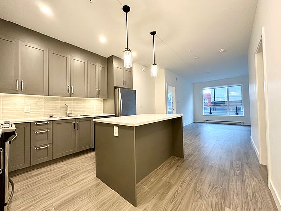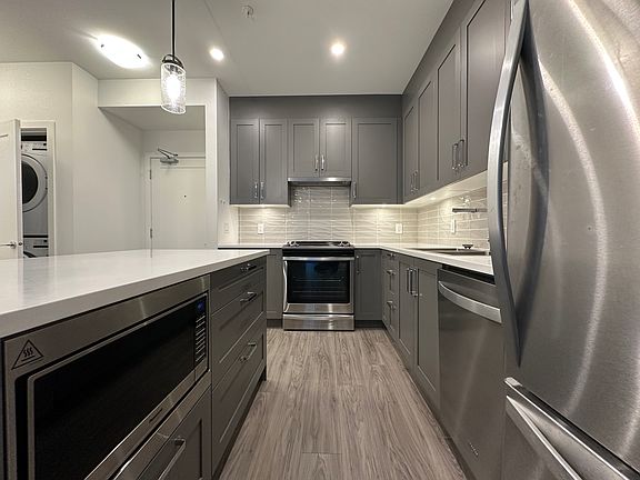 Open-concept layoutStylish kitchenStainless steel appliancesShaker-style cabinetryLaminate flooringNorth-facing deck
