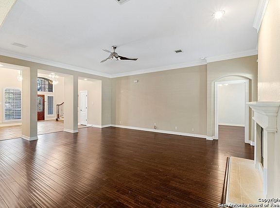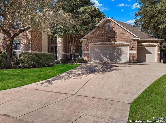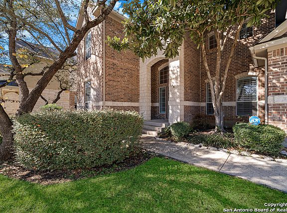 WANT LOTS OF SPACE? This 4118 sq ft, 4 Bed, 3.5 Bath, Open Floor Plan home with 10' ceilings in Rogers Ranch is for you! Enjoy a large Island Kitchen with stainless appliances, Gas Cooking, double ovens, and solid counter tops. There's a Sunroom off the Breakfast Area, and a separate Dining Room. Hardwood Floors in the Living Room and Master Bedroom, ceramic tile downstairs. Upstairs, a large Game Room with French Doors in the balconies, Bedrooms 3 & 4 are connected by a Jack-n-Jill bath. The home has a 3 Car Garage, flagstone back patio under a pergola, and mature trees. Enjoy neighborhood amenities including Gated Access, Pool, Jogging Trails, and Tennis Court. Fantastic location with convenient access to La Cantera, The Rim, Fiesta Texas, Salado Greenway, and much more.