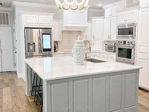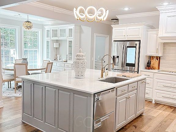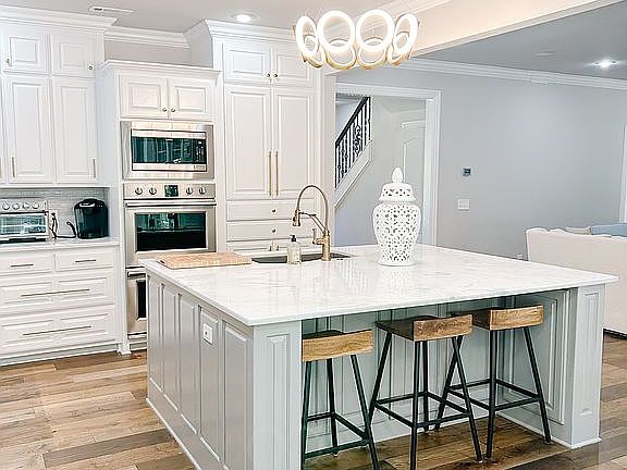 Step inside to an open floor plan with a chef’s kitchen featuring a massive island, stainless steel appliances, and updated flooring, paint, and countertops. The main floor includes a spacious primary suite with a spa-like bath (jacuzzi tub, walk-in shower, dual closets), a dedicated office, formal dining room, and laundry.