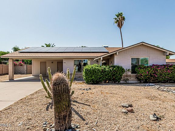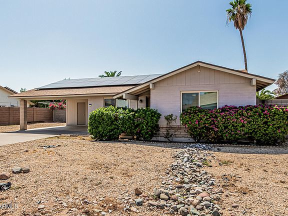 A charming 3-bedroom, 2-bath, turn-key residence is now waiting for a new owner! Displaying a 2-carport and desert landscape. Inside, you'll find vaulted ceilings, a neutral palette, wood-look floors throughout, & an inviting living room. The great room features a warm fireplace and sliding doors to the backyard. Pristine kitchen showcasing white shaker cabinets, SS appliances, and granite counters for all your cooking needs. Incredible savings with owned solar panels to be paid off at close of escrow by seller!