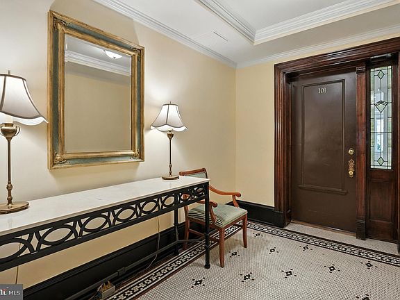 Welcome to Unit #101 at The Kalorama, a prestigious boutique Beaux Arts condominium that blends timeless architectural elegance with modern updates. This elevated main-level residence greets you with an elegant entry foyer featuring marble floors and a custom stained-glass sidelight, leading into a spacious living and dining area with soaring ceilings, refined trim work, a gas fireplace, and abundant natural light from oversized windows, including the building’s signature owl’s window. The well-appointed kitchen boasts Sub-Zero and Viking appliances, white cabinetry, and granite countertops. The home offers two bedrooms, including a primary suite with a walk-in closet and en-suite bath, plus a second full marble bathroom. Additional highlights include new recessed lighting, hardwood floors, central heating and cooling, and an in-unit washer and dryer. The Kalorama is a pet-friendly building known for its striking Beaux Arts design, beautifully maintained common areas, and convenient elevator access. Perfectly situated in the heart of Kalorama, residents enjoy a vibrant neighborhood filled with cafés, restaurants, and historic charm, just moments from Dupont Circle, Adams Morgan, and Rock Creek Park. With a Walk Score of 96, the home is only steps from grocery stores such as Streets Market, Harris Teeter, and Yes! Organic Market, along with easy access to neighborhood parks, recreation centers, and the Woodley Park Metro Station.