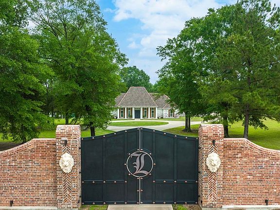 Welcome to your luxury estate nestled on 35.6 acres of pristine land in the heart of East Texas, known as Joaquin, Tx. just minutes for the LA Border. This property offers a stocked 5 acre watershed lake, amazing oak trees, and a custom built gazebo, here you will find the ultimate in exceptional living. The home boasts a parlor room, four spacious bedrooms, floor to ceiling windows overlooking the lake, 10 ft. flat, 11 ft. flat, and a 21 ft. vaulted ceiling. Barrell ceilings grace the entry and the master bath. The kitchen is a chef's dream with double islands, leathered marble countertops, custom glass inlays, dovetail drawers, imported hardware and much more. It has Thermador appliances, ample storage and a butler's pantry with marble backsplash and all wooded custom cabinets. Brazilian hardwood floors give this home the luxury feel you have been looking for. Pair all of this with the Restoration hardware fixtures, all wood custom moldings and you have a true luxury home. As you approach this property, you will be immediately struck by the beauty of the custom hand carved granite lion heads accented along the nine foot to fourteen foot brick roman style wall surrounding the solid iron custom gate. The English bond, Flemish blond, and herringbone patterns make this entry wall breathtaking. It is truly a work of art. The gated entry creates an impressive atmosphere that sets the tone for the rest of the property. The interior features of this home boasts of granite and marble counter tops, leathered marble countertops, specialty hardwood and marble floors, solid hickory doors, and all wood custom built-ins throughout. Enjoy hosting guests in the spacious living room with 21 ft. penny gap shiplap ceilings, and floor to ceiling windows offering a breathtaking view of the landscaping. The primary suite is a sanctuary with triple stepped ceilings, three step custom crown and a beautiful view overlooking the lake. The master bath offers a luxurious and relaxing retreat complete restoration hardware fixtures, marble floors, his and hers vanities, claw foot tub, and a multiple headed marble tiled shower with body sprayers. Step outside and you will see a glimpse of Joaquin history. The bridge that spans across the 5 acre lake has the original railing restored from the historic Logansport Bridge that connected Joaquin, Tx. to Logansport, LA. Spend the afternoon fishing for bass, crappie and perch or sunbathing on the deck. For the more adventurous, make a splash in the lake off of the zipline or diving board! You'll also find picturesque walking trails, where you'll see the different varieties of trees, water oak, red oak, and cypress cedar to name a few. Finish up your day at the gazebo or outdoor patio by the lake to end the perfect day. Don't miss your chance to own this truly exceptional luxury homestead that seamlessly blends indoor and outdoor living, creating the ultimate escape from the hustle and bustle of city life ! Call the listing agent or your favorite agent to get an appointment to see this beauty!!