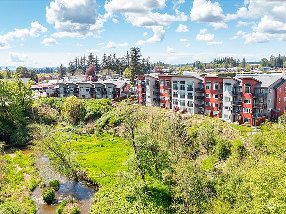 Light and bright, top floor end unit! Welcome home to your airy 2 bedroom condo in the heart of Lynden. With windows on three sides of the unit and vaulted ceiling in the living room, you will always enjoy the natural light and fresh breeze even on those grey PNW days. Built in 2020, this unit still feels fresh and new with quartz countertops, stainless appliances, and new washer/dryer in 2023. Relax on your private balcony, overlooking a tranquil green space with a creek down below, and the mountains in the distance. Ideal location close to restaurants, shopping, and easy access to the Guide Meridian and Canadian border. Low HOA dues cover central hot water, W/S/G, grounds maintenance. Designated covered parking space + storage unit.