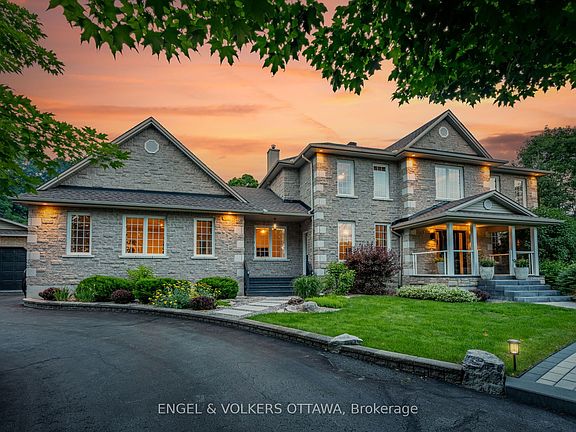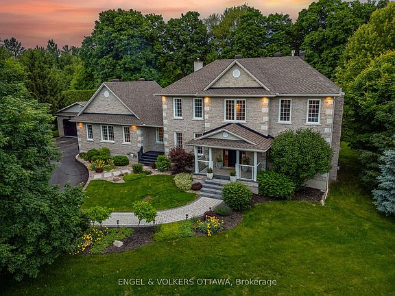 A stunning residence nestled on a private 2-acre lot, this home boasts 4,500 sq ft+ of spacious, separate living areas w/ high ceilings throughout. The flexible floor plan offers options for an in-law suite or home office. The true gem of this property is the backyard oasis. Dive into the luxurious saltwater pool, complete w/ a tranquil rock water feature. Entertain guests at the outdoor bar or enjoy a meal on the patio. As the evening cools, gather around the firepit or unwind in the hot tub under the stars. Enjoy the beauty of all seasons in the sunroom, feat. heated floors & auto rain sensor skylights. The kitchen is a chef's dream w/ ample prep space, a dbl fridge/freezer, gas range, breakfast bar, & dedicated dining area. Upstairs, the primary suite offers a 5-piece ensuite & walk-in closet complete w/ a cozy fireplace. 3 additional bedrooms make this home perfect for families. Located just a quick commute from Kanata, this home combines luxury & convenience in a serene setting.