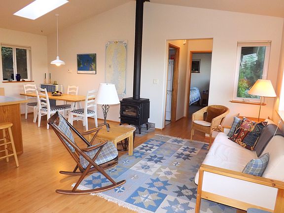 This delightful seaside cabin is just steps away from an incredible no-bank stretch of sandy beach, with amazing views of Hales Passage and Mt. Baker. The charming home is beautifully built and maintained, leaving nothing for you to do but enjoy the view from big windows in front, or lounge on the deck and watch the water. The landscaping is lovely, but also easy-care. There are 2 bedrooms & 2 baths, and a great room with a well designed kitchen and spacious dining area. This is special!