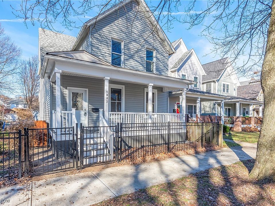Beautiful Ohio City colonial with 3 FULL bathrooms, ready for immediate occupancy. Over 2,000 square feet of living space, first floor laundry, and a 2.5 car garage, this home truly will have everything you've been looking for. The welcoming front porch that has recently been rebuilt is the perfect place to start your morning with a cup of coffee. The first floor is spacious and a true open concept. Brand new LVP flooring and neutral paint throughout. The 10' island is ideal for entertaining. Upstairs is the freshly painted primary bedroom with vaulted ceilings, a large walk-in closet, and an en suite full bath. Two additional well-sized bedrooms round out the second floor with a shared bathroom. You'll love the fully fenced in backyard that has a deck and plenty of room for your pup to play. This property also features new vinyl siding on the main house. Ideal location, just north of Bridge Ave. and walkable to neighborhood favorites.