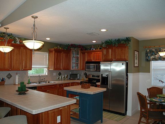 Paradise found! This 4/2.5 has an extended floor plan & lots of upgrades. Beautiful mahogany front doors, large foyer & spacious dining room with high ceilings. Large custom kitchen w/ cherry wood cabinets, stainless steel appliances and breakfast nook overlook a huge great room with plenty of room for large gatherings. The oversized master suite features his & her closets, tray ceiling & spacious bath with Roman tub & separate shower. Other upgrades include the tile flooring throughout the main living area & baths, central vacuum, alarm, CAT-5 wiring, surround sound, water softener, custom wood trim & upgraded fixtures. The home is surrounded by lush tropical landscaping with mature palms & bromeliads. Escape to the backyard & relax on the covered, pavered patio and huge deck & enjoy the pool, tropical breezes & even sunsets. The back yard is fenced and has a 30'x 40' boat slab. The best lot in the neighborhood with a premium location at the end of a quiet, low traffic cul-de-sac! Neighborhood Description Quiet neighborhood, perfect for families and children with low traffic cul-de-sac. Wonderful.