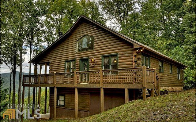 Stunningly beautiful mountain and pasture view from this 2 bedroom 2 bath log sided cabin. Totally private with circular driveway and plenty of easy parking. At end of the road is National Forest and below the cabin is a GA Wildlife Mgmt area. Gracious cabin with both bedrooms on the main floor, master has electric fireplace. Windows everywhere to enjoy this breathtaking view and a screened porch on the view side across back of the cabin with double door access from both great room and master bedroom. Full unfinished basement with propane heater in the basement useful in the event of power loss. Gated community with clubhouse, playground, tennis courts, swimming pool, picnic areas, campground for 6 campers, and several lakes for fishing.