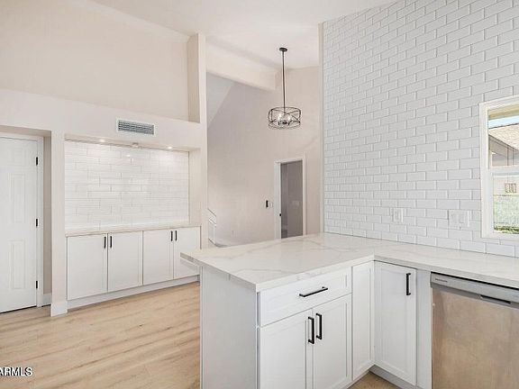 Home includes FULLY OWNED SOLAR PANELS, NO LEASE, NO LOAN! This beautifully remodeled home features 3 bedroom plus a BONUS ROOM with private entrance accessible from both the garage and the backyard, perfect as a 4th bedroom, a 2-car garage, stylish pavers, and charming brick accents. You'll be delighted by the captivating living room with soaring vaulted ceilings, a soothing palette, wood-look flooring, and double French doors that lead to the backyard. The eat-in kitchen boasts quartz counters, a subway tile backsplash, white shaker cabinets, SS appliances, a pantry, and a peninsula with a breakfast bar.