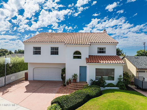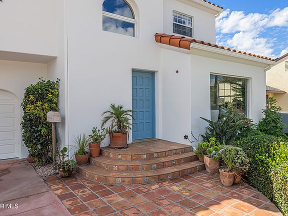 Live near the Sun and Surf like a dream come true. Striking Spanish Revival inspired Ventura coast home, originally built in 1949 and re-built new in the late 1980's. Offering approximately 3,001 square feet across two levels, this residence combines timeless character with modern comforts. The main floor features a spacious den or office with a full bath, a formal living room with a large picture window, and a generous kitchen designed to gather everyone in the heart of the home. Kitchen highlights include a charming fireplace, commercial grade stove with griddle, ample cabinetry, extensive counter space, and multiple windows and French doors that open to the verdant backyard. With the fire glowing and conversations flowing onto the patio, this kitchen is an entertainer's dream. A dramatic staircase leads to the upstairs bedrooms, all filled with natural light. Three bedrooms share a well appointed hall bath with dual sinks and a full tub shower. One whimsical bedroom features a loft with a picture window, sparking the imagination. The dramatic primary suite offers soaring ceilings, a massive walk in closet, and a private study or office with its own brick fireplace. Step out onto the balcony and enjoy views of the lush garden below and, on clear days, the sparkling Pacific Ocean. Located near the historic coastal railway line passing 4 times daily, this home offers convenience and charm without heavy freight traffic. The trains pass quickly typically under 30 seconds. Additional features include a three car tandem garage with cabinetry, an indoor laundry room, and a backyard designed for both beauty and ease of living. Multiple seating areas, a water feature, a gas fire pit, citrus trees, and an easy care deck create a magical outdoor setting. This remarkable property invites you to immerse yourself in coastal living, with the beautiful beach less than a mile away.