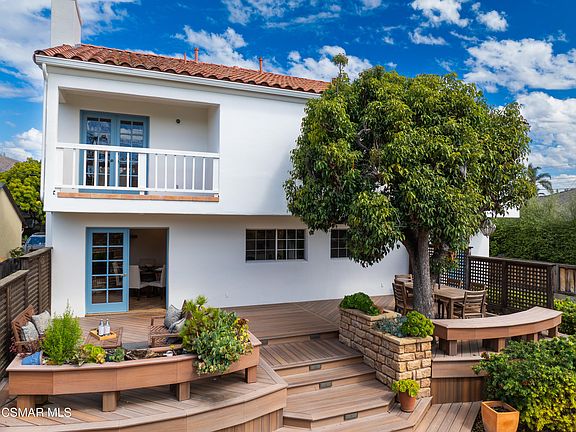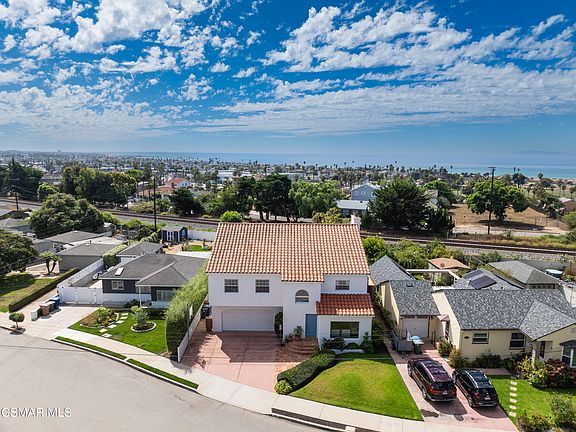Striking Spanish Revival inspired Ventura coast home, originally built in 1949 and thoughtfully expanded and renovated in the late 1980's. Offering approximately 3,001 square feet across two levels, this residence combines timeless character with modern comforts. The main floor features a spacious den or office with a full bath, a formal living room with a large picture window, and a generous kitchen designed to gather everyone in the heart of the home. Kitchen highlights include a charming fireplace, commercial grade stove with griddle, ample cabinetry, extensive counter space, and multiple windows and French doors that open to the verdant backyard. With the fire glowing and conversations flowing onto the patio, this kitchen is an entertainer's dream. A dramatic staircase leads to the upstairs bedrooms, all filled with natural light. Three bedrooms share a well appointed hall bath with dual sinks and a full tub shower. One whimsical bedroom features a loft with a picture window, sparking the imagination. The dramatic primary suite offers soaring ceilings, a massive walk in closet, and a private study or office with its own brick fireplace. Step out onto the balcony and enjoy views of the lush garden below and, on clear days, the sparkling Pacific Ocean. Additional features include a three car tandem garage with cabinetry, an indoor laundry room, and a backyard designed for both beauty and ease of living. Multiple seating areas, a water feature, a gas fire pit, citrus trees, and an easy care deck create a magical outdoor setting. This remarkable property invites you to immerse yourself in coastal living, with the beautiful beach less than a mile away.