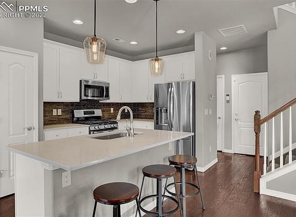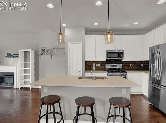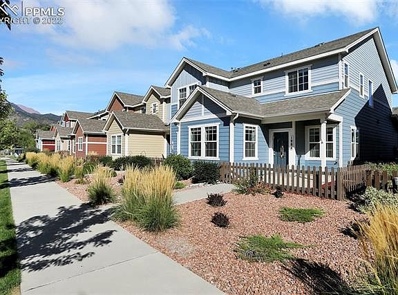 Rare opportunity to live with Cheyenne Mountain view in the coveted Gold Hill Mesa complex. This six year old home has all the updates! Island in kitchen with quartz counters, soft-close cabinets, pull out waste container, 5 burner gourmet gas stove, stone back splash. High end laminate wood flooring, carpet and pad. Heated floors in Primary and guest bath. Barn door in Primary Suite.. Tall vanities in upstairs bathrooms. Extra storage shelving in garage. Immaculate and ready to move in! Easy drive from I-25 and quick access to Hwy 24. A stones throw to Bear Creek Dog Park. Stunning Cheyenne Mountain views.The community center in Gold Hill Mesa offers a recreational room, fitness center, concerts in the park, and much more! Community living at its finest for an unusually low HOA fee.