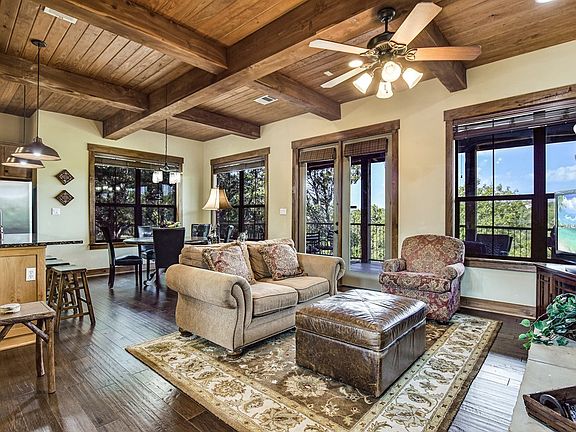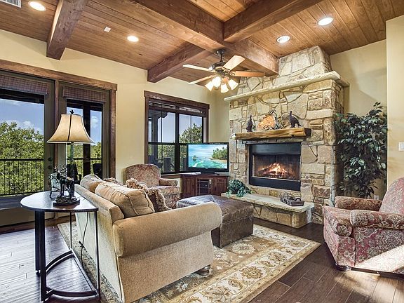 Charming 3/3.5 cottage tucked in the trees on an oversized lot overlooking a canyon and nature area in The Hollows. Semi-private driveway with a two-car garage. Vacation Rentals Allowed. A calm feeling overtakes you as you enter and see the views off the deck. Wildlife and birds abound, stunning sunsets brighten the distant hill country. Inside you are greeted with lovely Hardwood floors, a large stone fireplace, a granite center island, utility room with a small office area and powder room. The living and dining area are all one, great for those family times. Master bedroom is located on the main floor with a spacious bath and closet. Both guest bedrooms are located on the upper level, each with an ensuite bath. Off the living area is a large covered deck and below you have a spacious patio/firepit area. Great for those evenings when it's cool enough for a fire and s'mores. Full access to the Hollows amenities, pools, trails, playground, lake access, grill, marina and more.