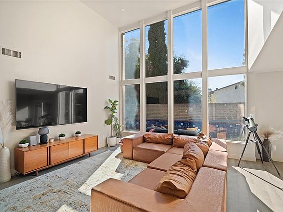 Living Room: Bathed in natural light, with soaring ceilings and dramatic 2-story windows.