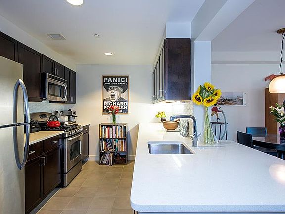 The huge chef's kitchen offers full-sized appliances, with abundant Shaker cabinetry, and glass-tile backsplash. A vast expanse of granite counters open onto an inviting dining nook, and the cozy living room beyond.