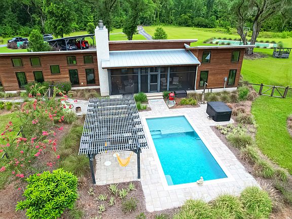 Wadmalaw Island country estate, surrounded by hundreds of acres of conservation land. Take a stroll around the property or on the nearby live oak-shaded sand roads, or hop in the golf cart and head next door to Ambrose Family Farm to pick up some fresh fruit and vegetables. This property is 30 minutes from downtown Charleston and the beaches of Kiawah! Upon entering the property, one is immediately mesmerized by the tranquility and beauty of the setting, boasting moss-draped oaks and lush green pastures. The current owners have transformed 15 acres into the most picturesque private oasis, which encompasses a beautiful home finished in 2021, along with a classic barn with an attached guest house and secondary private office. The property is complete with a gorgeous saltwater mineral pool, athletic court, green house, pond, raised gardens and fenced pastures currently being utilized for a small herd of cattle. The main house was built for entertaining but also for relaxed everyday living, featuring an open floorplan with accordion style doors that lead seamlessly to the screened in porch with fireplace, all overlooking the beautiful pool and pastures. Significant exterior architectural features of the main house include cypress siding and trim, standing seam metal roof, Pella aluminum clad windows and doors with impact glass, 2 x 6 wall construction, spray foam insulation, and elevated slab foundation-eliminating all of the problems associated with crawlspaces. The interior walls and ceilings are cypress shiplap except for a brick front wall, which adds texture and complexity to the beautiful spaces. Additionally, the family room is adorned by a beautiful fireplace to be enjoyed along with soaring ceilings. The barn, ca 2019, is approximately 1500 sq ft with 14 ft clear ceiling height and 10 ft overhead doors at each end. There is an additional 12 x 50 covered area with 12 ft height and includes sewer and 30 amp power connections--perfect for an RV. The attached one bedroom/one bathroom guest house features an open floorplan for living and dining with a full kitchen. This space is very flexible and is currently being used as an artist's studio. With over 40 years of construction experience, the current owner utilized the highest quality materials and latest construction products and techniques, ensuring a home that will be low maintenance, exceptionally weather tight and problem free for decades; the outstanding construction quality extends behind the walls too! Both the main house and guest house have separate generator capability and each has a completely independent septic system. Enjoy a deep well with a reverse osmosis system providing 3200 gallon per day capacity, with a 1000 gallon cistern. Approximately 8 acres of the 15 acres are bahia grass pastures, enclosed with a high tensile electric 4 wire fence and includes a central water station. The high tunnel loophouse (green house) is 16 x 20 and is fully irrigated. The multi-use sport court is 30 x 56 and is perfect for pickleball, basketball, volleyball and badminton, Truly this property is the perfect place to call home whether it is a primary or secondary home. The barn and land would also work well for horses too! Come live and play on Wadmalaw Island and enjoy all the easy conveniences of grocery stores, restaurants and marinas just 15 minutes away with Charleston, Kiawah, world glass tennis and golf courses all within 30 minutes. This property is one of a kind and would be exceedingly difficult to recreate.