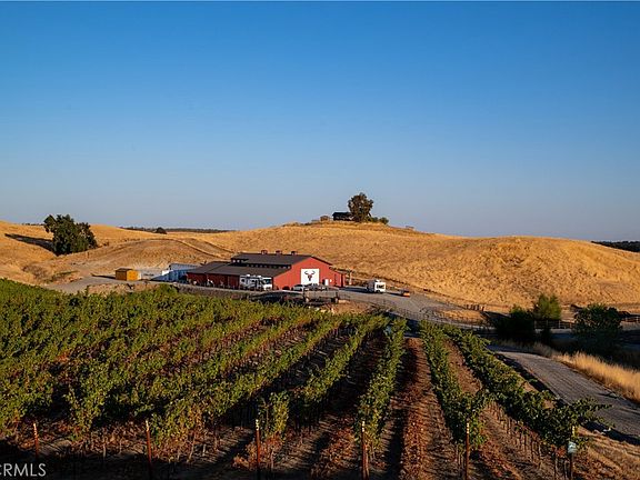 The property features a 4,560 sq. ft. event/wine barn (2019) with historic tasting bar, separate wedding party rooms,restrooms, and temperature-controlled wine storage. The 2,000 sq. ft. custom hilltop home offers 3BR/2BA and sweeping views. Property is under Williamson Act, providing tax saving benefits.
