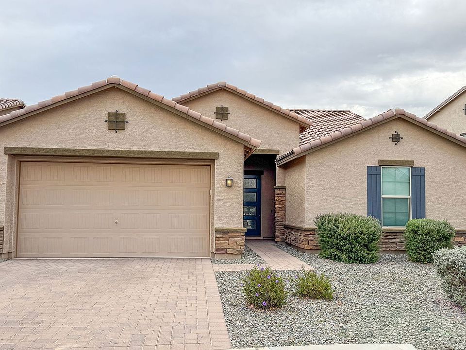 All appliances included (washer & dryer hook-ups only). Carpet and tile flooring, ceiling fans, and blinds throughout. Primary suite with double sinks + vanity, walk-in shower, large walk-in closet, and separate toilet room. Covered patio perfect for relaxing or entertaining. Situated in the beautiful Windrose at Zanjero Trails community, Close to shopping, schools, restaurants, and entertainment. Scenic mountain views and nearby outdoor recreation. This is a must-see! Perfect for anyone wanting a clean, modern home in a fantastic neighborhood.