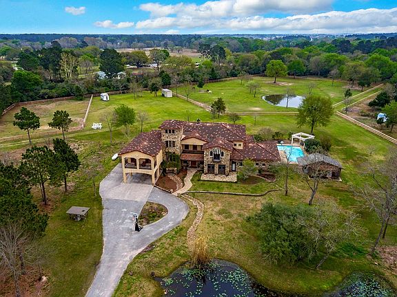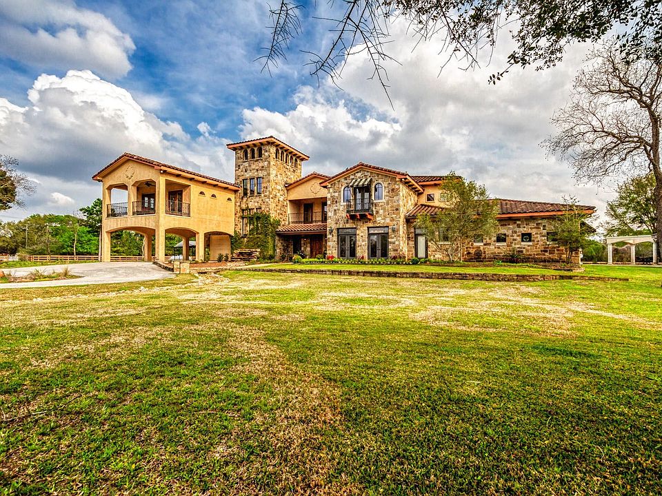 A magnificent Mediterranean estate home w/a Spanish flare on nearly 20 acres where privacy abounds*A myriad of opportunities for entertaining * Large family room & 2 gamerooms (one on each level) * Fabulous covered patio w/custom Summer kitchen & pool * 3 fishing ponds, terraced grounds, fenced pastures for horses & sand arena for riding * Wood flooring in private master & in all bedrooms* Travertine flows thru entry, kitchen area, bathrooms & living areas* Gourmet kitchen w/Granite counters, Dbl Thermador ovens, KitchenAid dishwasher, Electrolux cooktop * 3 of the 5 HVAC systems 2016 * Tile roof * Fresh paint 2016 *Private flex area on 2nd floor (3 spacious rooms & full bath that can be quarters, private offices or more living area + private stairway)*Many custom built-ins, fixtures, ceilings & balustrades * 3rd story tower & observation deck * Sq footage 7939(per appraiser),7424 per HCAD)*5 min to 99, 10 min to 290*A country feel so close to the city*You'll love it!!
