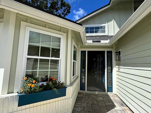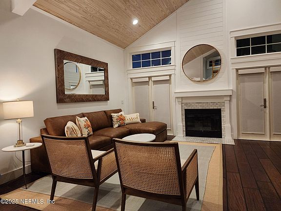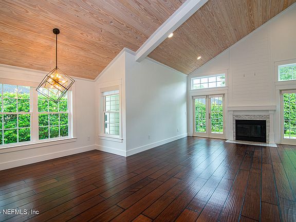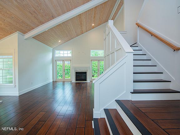 Welcome to your dream beach house! This newly remodeled home is situated in Jax Beach's only gated community, The Sanctuary. This modern, updated, 2-story home features 3 bedrooms, 2.5 baths, and a 2-car garage. Beautiful curb-appeal, corner /cul-de-sac lot with an expansive paver driveway and front patio. The open-concept living area features breathtaking 20-foot tongue-and-groove pine vaulted ceilings, along with a chef's kitchen that includes custom cabinets, 10' quartz island, a 36-inch farmhouse sink, and a 36'' Thermador dual-fuel range. The living area includes a wood fireplace, custom millwork, and wood floors. The 1st-floor primary bedroom features an updated spa bathroom and a spacious walk-in closet. Upstairs, there are two bedrooms and a newly upgraded bathroom. Situated on the Intracoastal Waterway, the Sanctuary offers a pool, nature trails, and pickleball courts. New roof in 2024, all windows and doors replaced, re-piped, and more! Ask for the complete list of updates!