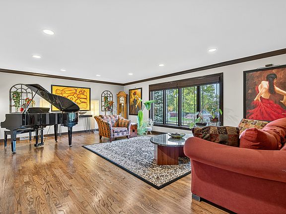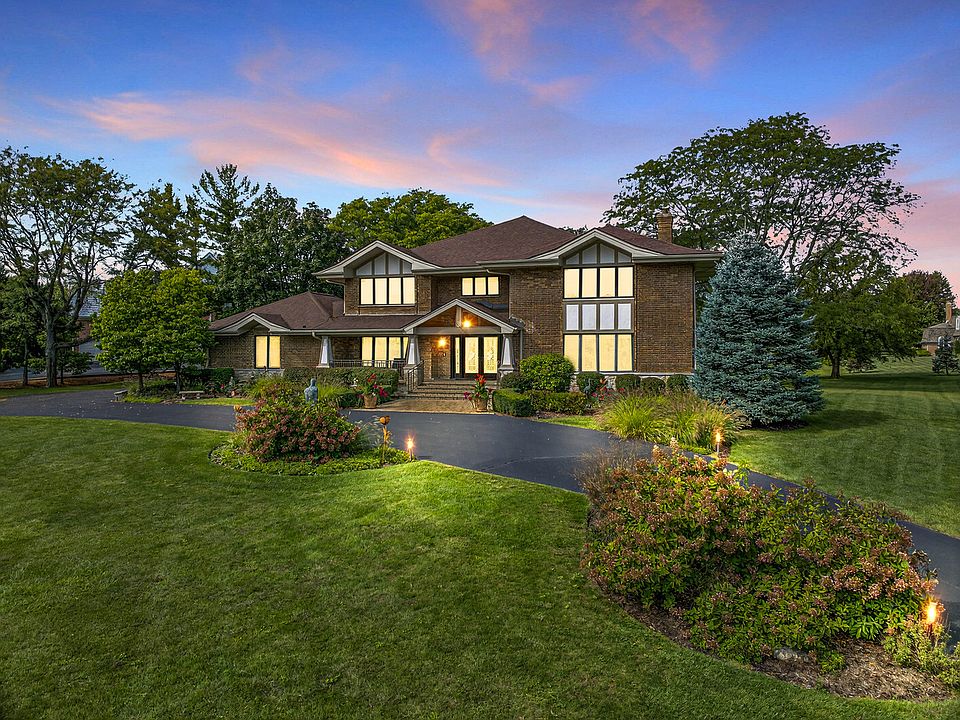 This stunning modern Prairie-style home sits on 1.36 acres, offering beautiful views of the lake just across the street. From the moment you arrive, you'll be welcomed by immaculate landscaping and a spacious front porch, perfect for morning coffee or relaxing evenings. Step inside to a grand entrance flanked by a formal living room on the right and a formal dining room on the left. Both rooms are filled with natural light thanks to large windows and feature gleaming hardwood floors that run throughout most of the home. Rich dark wood trim and doors add warmth, character, and timeless charm. The formal living room opens to a large home office or den, which flows into a cozy family room complete with a fireplace and direct access to the back deck. The oversized kitchen is an entertainer's dream, boasting an extra-long Quartzite island with breakfast bar, double ovens, an oversized refrigerator, and plenty of space for a breakfast table. Just off the kitchen, you'll find a convenient laundry room. Upstairs, your luxurious primary suite awaits. Enjoy a spa-like en-suite bathroom with double sinks, a whirlpool garden tub, and an oversized shower. The massive walk-in closet features custom shelving to meet all your storage needs. Three additional spacious bedrooms are located on the second floor, each with its own private en-suite. On the third floor, a versatile loft space is ideal for a playroom, home gym, library, or whatever fits your lifestyle. The finished basement offers the ultimate hangout space with a large living area, game room, billiards space, and a custom-designed bar-perfect for entertaining. Outside, enjoy the expansive backyard and large deck, surrounded by scenic views in every direction. The attached 3.5-car garage and generous driveway provide ample parking. Recent Updates Include: new AC in August 2025, newer wood floors on 2nd level, sealed driveway 2024 and so much more. This one-of-a-kind home combines comfort, elegance, and functionality in a breathtaking setting. Don't miss your chance to make it yours!