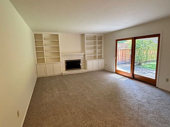 This 3 bedroom 2 bathroom home is located in the heart of Bennett Valley and is just over 1,350 square feet. It features new paint and carpet throughout. Through the front door and to your left is the large living room with gas burning fireplace, built in cabinetry and a French door leading to the covered patio area. The large kitchen features Corian countertops, gas cooktop, built in oven, microwave dishwasher and refrigerator (provided but not warranted). The dining room is located off the kitchen areas with more built in cabinets and a sliding glass door to the back yard patio area. Down the hallway 2 carpeted bedrooms share a full hallway bathroom with tub/shower combo. The carpeted primary bedroom is located towards the back of the house and features 2 closet areas and the primary bathroom with walk in shower. There is a large private backyard that backs up to a creek with a covered patio area. Attached 2 car garage with washer and dryer provided (not warranted) Landscape service included. One small dog negotiable. Sorry no co-signers. 1 Year Lease (MT)