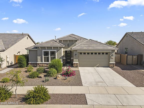 Welcome HOME! Stunning 4bd/3ba located in the Zanjero Trails community. Spacious 2530sqft home nestled on an 8051sqft lot.Home features: inviting living space, wood tile flooring, gourmet kitchen, granite countertops, wet bar, SS appliances, owned ION exchange water softener, security system,10ft ceilings, elegant fixtures, neutral colors.Spacious primary with tray ceilings and large walk-in shower.Multi-sliding door leads you to your own backyard paradise with mountain views and no behind neighbors. Outside features: solar, gazebo, raised paver patio with accessibility ramp, gas fire pit, electrical outlets, gas plumbed for BBQ and river rocks. Community features: close proximity to schools, shops, eateries, new Oasis swim center/park & the White Tank Mtns. It's a BEAUTY inside and out!