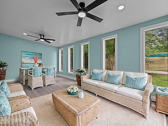 The sunroom extends the living space and connects seamlessly to the deck, patio, and fireplace a welcoming setting for family nights or weekend gatherings.