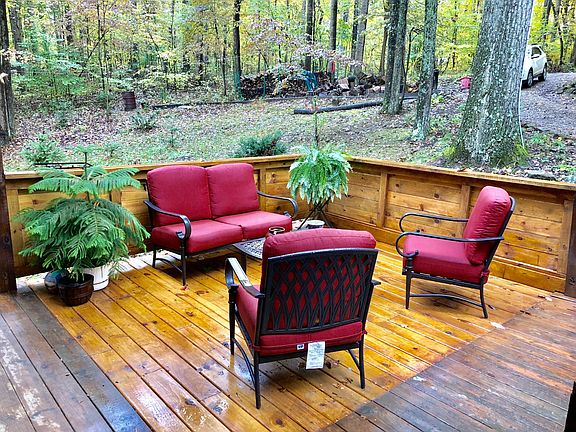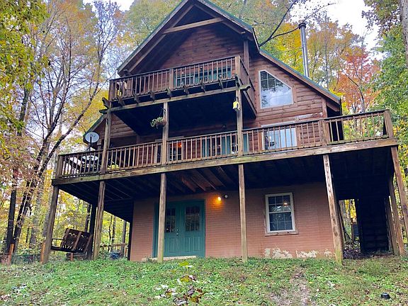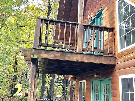 This gorgeous log home is waiting on you! A 3 bedroom, 2 full bath cabin with knotty pine ceiling beams, cathedral ceilings, hickory cabinets, and walnut floors. It could make a lovely full-time home, or a fantastic rental. Relax with your coffee in the morning on the bedroom balcony, or entertain friends and family in the lower level living room and start a bonfire somewhere on the 2.42 acres!